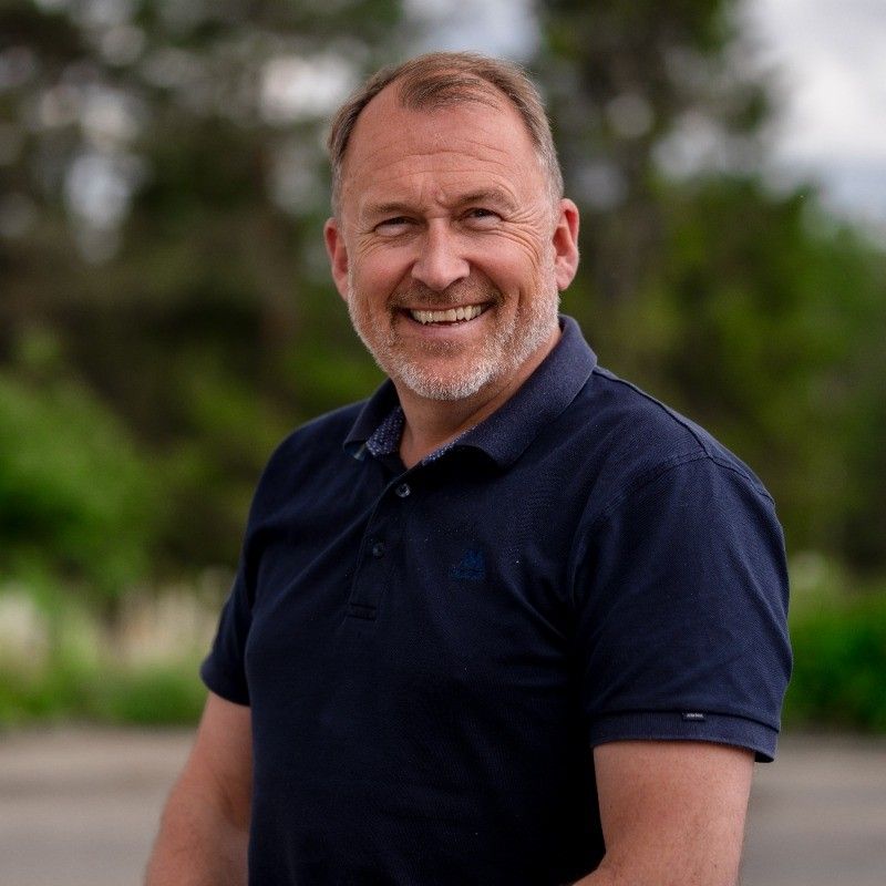 Midaldrende mann med kort, brunt hår og skjegg smiler. Han har på seg en mørkeblå poloskjorte. Grønn bakgrunn.