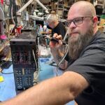 *   **Tekniker med skjegg jobber med et elektronisk apparat.**